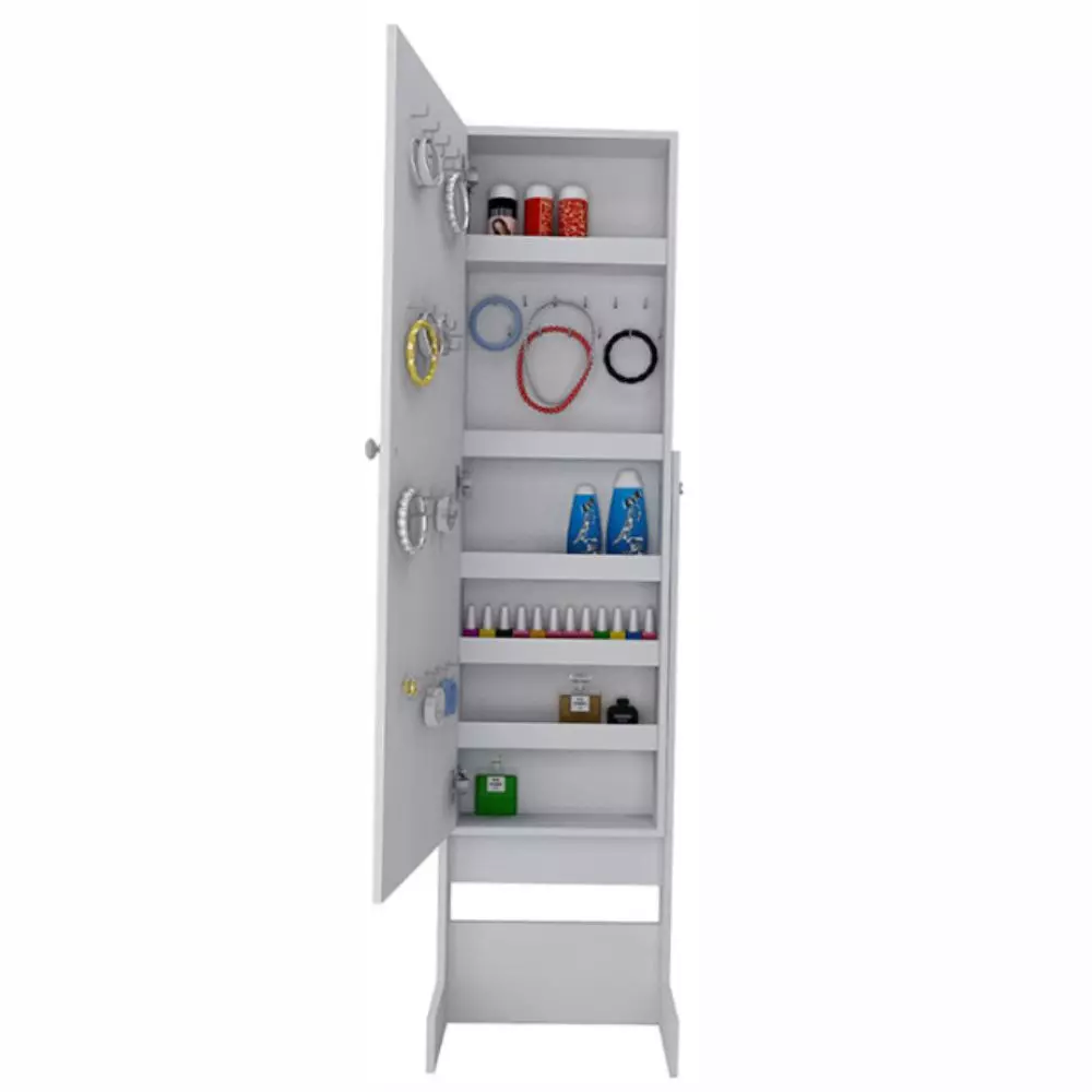 ganchos para colgar, estantes y espejo en puerta con cerradura.